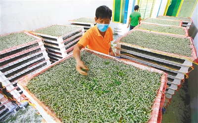 “我们农户养的都是四龄蚕和五龄蚕,蚕苗由镇政府和合作企业提供。” 陈世锦告诉记者,从给蚕第一口叶到其眠起饷食前称为一个龄前。一龄蚕至三龄蚕为小蚕期,四龄蚕至五龄蚕为大蚕期。