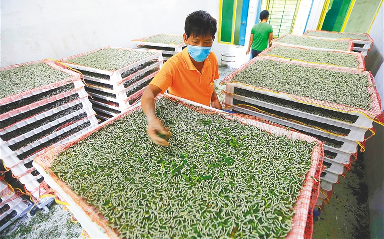 陈世锦说,村里人把这些蚕宝宝称为“天宝”。在陈世锦的带动下,全村38户村民一起种桑养蚕。湾岭村原有23户贫困户,截至去年底已完成脱贫21户。