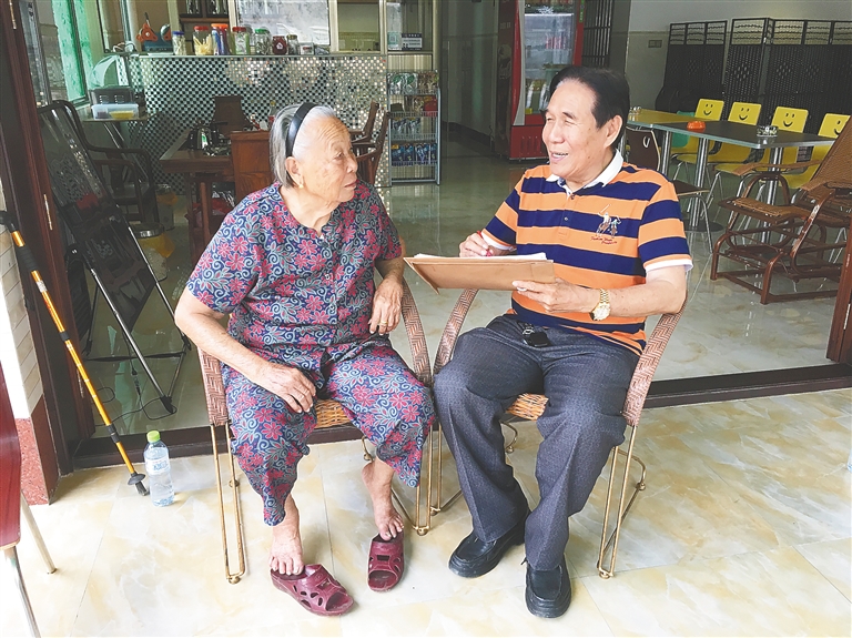 落日余晖穿过婆娑椰林,在文昌市东郊镇良田村一处农家院落,年过九旬的黄玉兰阿婆正在椰子树下边回忆边念唱,身旁的朱运行边听边记录。