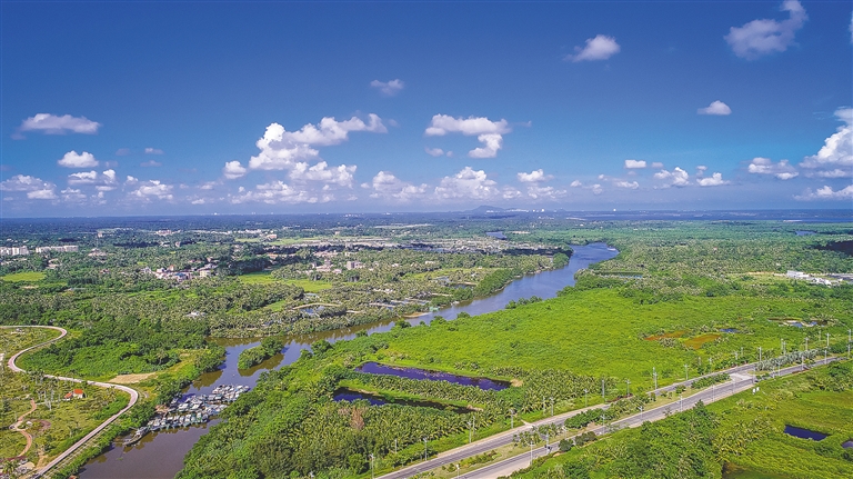 日前,俯瞰文昌霞洞湖水生态综合整治工程,一体化设备在作业。目前工程进展顺利,体育馆、游乐园等配套项目正在抓紧施工,预计今年9月底完工。
