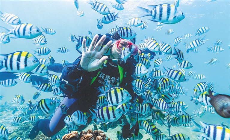 近日,在陵水分界洲岛旅游区,游客在海里潜水时被一群斑马鱼包围。连日来,省外多个地区持续高温,不少游客选择到海南避暑游玩,潜水、游泳等亲海项目受到了他们的欢迎。本报记者 武威 通讯员 童国强 摄