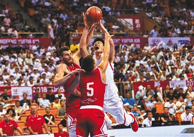 8月17日,在深圳举行的2018斯坦科维奇杯洲际篮球赛最后一日比赛中,中国男篮蓝队以73:79不敌克罗地亚队,3战1胜2负获得第三名。克罗地亚队三战全胜获得冠军。图为中国男篮蓝队球员胡金秋(右上)在比赛中上篮。新华社发
