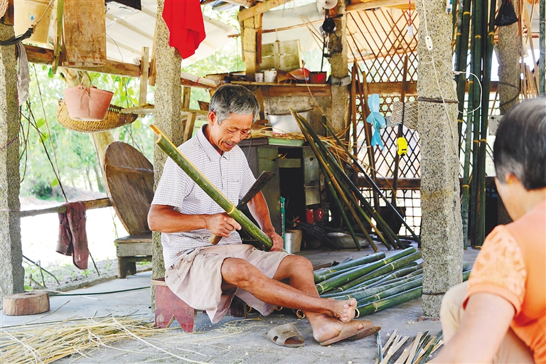 今年64岁的黄东喜,是万宁市大茂镇红庄村的一名竹器匠人。在万宁大茂镇红庄村周边,有着近50年竹器制作经验的黄东喜,凭借着精湛的手工技艺,在当地小有名气。今年4月,印度著名竹艺设计师Sandeep Sangaru就曾来到黄东喜家,与他交流竹编手艺。