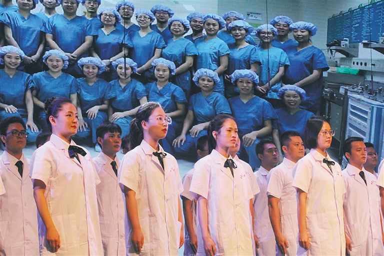 “妈妈在病房,儿女在他乡,你的笑靥,让她在爱的海洋中徜徉,嘘寒又问暖,把尿又喂汤……”在庆祝活动现场,一首在海南省人民医院取景拍摄的歌曲MV打动了众多在场的观众。这首歌曲以海南省人民医院真实的故事为背景,歌词真挚,旋律感人,将温情的医患故事娓娓诉说。