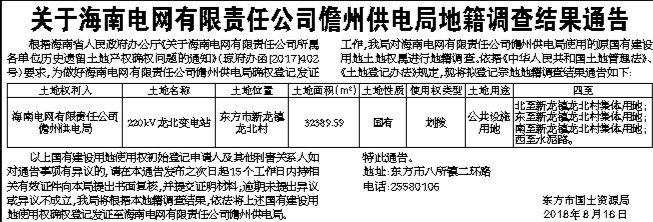 关于海南电网有限责任公司儋州供电局地籍调查结果通告