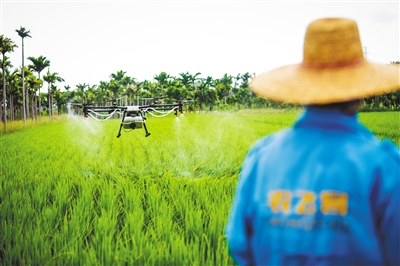 8月18日,琼海市博鳌镇北山村,无人机正在为水稻喷药防治病虫害。据了解,用此种方式喷洒农药,可大幅减少农药用量。