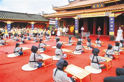 立秋刚过,三亚崖州区宁远河畔微风习习。8月18日上午9时许,宁远河北岸的崖州孔庙门庭若市、热闹非凡。未进宫门,已听得书声琅琅,稚嫩清雅的童声吟诵:珠崖风景水南村,山下人家林下门。鹦鹉巢时椰结子,鹧鸪啼处竹生孙……