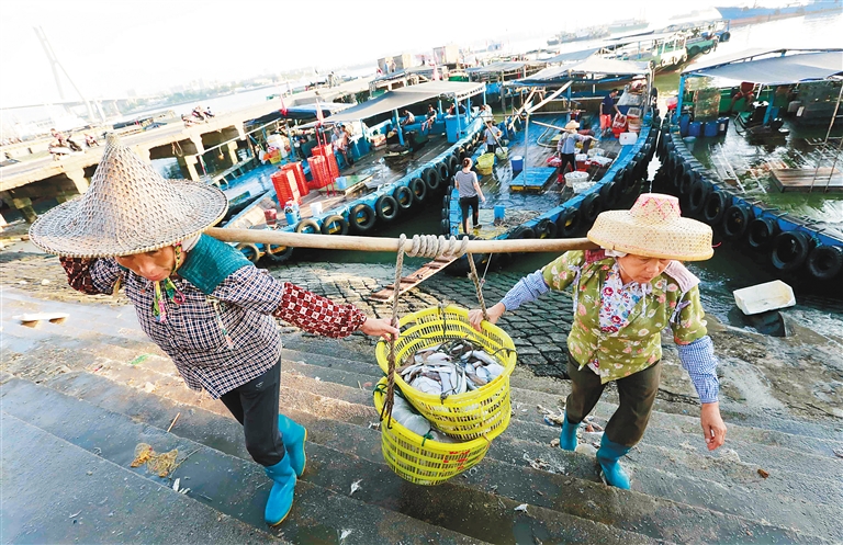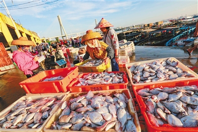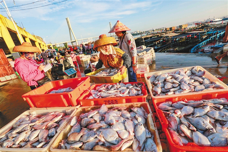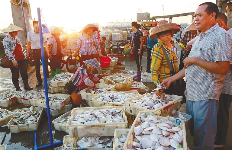 8月22日清晨,儋州市白马井中心渔港,阳光明媚,风平浪静,出海归来的渔船停满港口,渔民们忙着装卸渔货,收购商与渔民进行交易,运送鲜鱼的车辆进进出出,村民们穿梭鱼市挑选心仪的海产品,处处洋溢着开渔后的欢喜气氛。