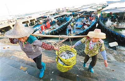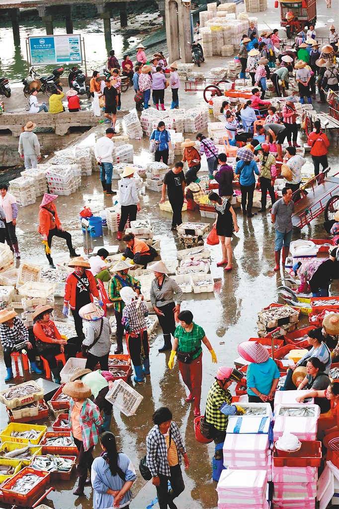 ④儋州市白马井中心渔港渔市热闹非凡的景象。