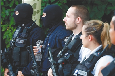 8月23日,在法国巴黎西南郊特拉普市,警方在案发现场附近警戒。