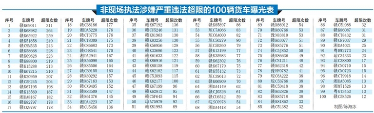 海南日报记者在“非现场执法严重违法超限车辆名单”上看到,公布的严重违法超限货车有100辆,有江西、湖南、广东、海南等省份,其中大部分为外地车,占8成以上。违法“大户”多为货车,超过200多次以上的有12辆货车。