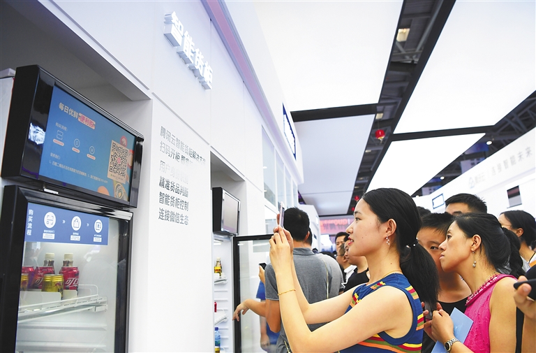 8月23日,观众在首届中国国际智能产业博览会上体验智能货柜购物。