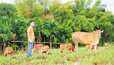 8月29日下午,雨过天晴,在澄迈县金江镇帮冲河岭,一群黄牛悠然地咀嚼着青草,金江镇龙坡村山内坡村民小组村民、澄迈慧牛小黄牛第二养殖基地负责人李传炳手持竹竿紧随其后,不时发出“吁、吁”的吆喝声,驱赶着牛群快点“回家”。
