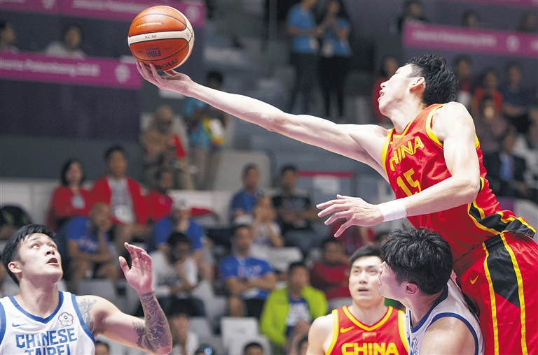 8月30日晚,在雅加达亚运会男篮半决赛中,中国队以86:63战胜中国台北队,挺进决赛。图为周琦(右)在比赛中。新华社发