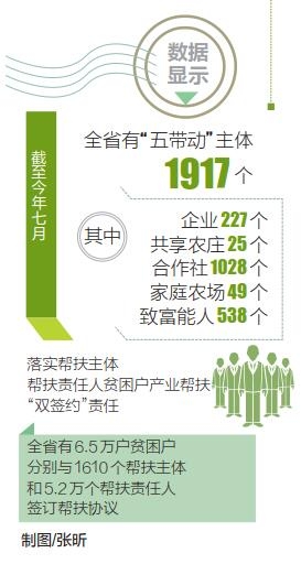 数据显示,截至今年7月,全省有“五带动”主体1917个,其中企业227个、共享农庄25个、合作社1028个、家庭农场49个、致富能人538个。落实帮扶主体、帮扶责任人与贫困户产业帮扶“双签约”责任,全省有6.5万户贫困户分别与1610个帮扶主体和5.2万个帮扶责任人签订帮扶协议。