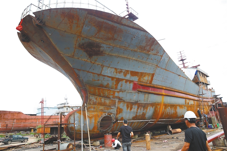 克服了自然环境的困难,凯鸿船舶利用现代化造船技术造出的钢制渔船十分受渔民的欢迎。“现在渔民更换的新型钢制渔船基本长度在30米到40米,主要以拖网船、刺网船、收货船为主,重约100吨,有专门的厨房、卧室、卫生间等设施。而木质渔船空间有限、重量和长度都无法与钢制渔船相比,更换新型的钢制渔船出海打渔碰见大风大浪安全系数提高很多,也更受渔民欢迎。”凯鸿船舶副总经理郑生斌介绍,当前,基地生产的钢制渔船不仅占有了本省多个市县、浙江、福建等国内市场,还远销至非洲莫桑比克。