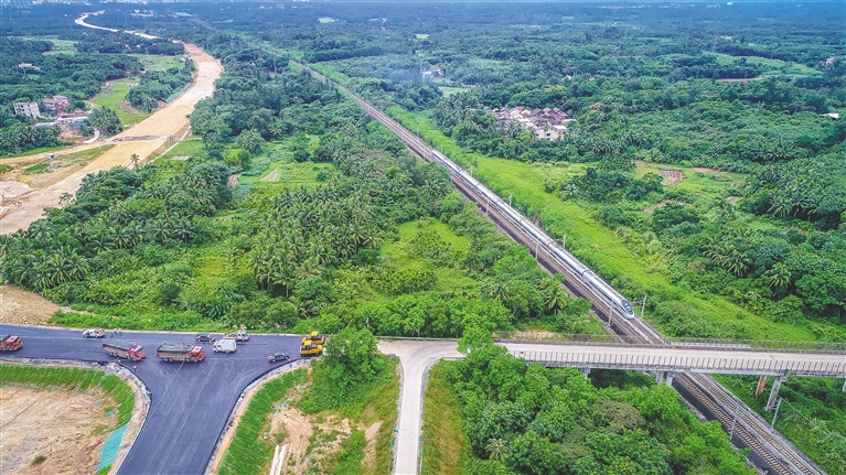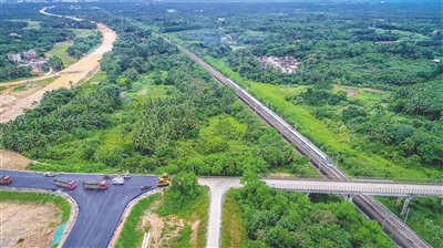 9月2日,俯瞰文琼高速公路文昌段的施工现场,各项工程正稳步推进。文琼高速公路作为我省“田”字型高速公路主骨架之一,起点位于海文高速文城终点处,终点位于琼海博鳌镇,全长65.7公里,预计明年11月份通车。本报记者 袁琛 摄