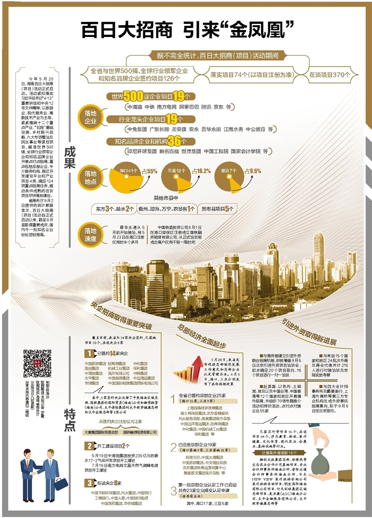 省商务厅9月2日提供的统计数据显示,百日大招商(项目)活动自正式启动以来,截至8月底取得重要成效,国内外一批知名企业纷纷进驻海南。