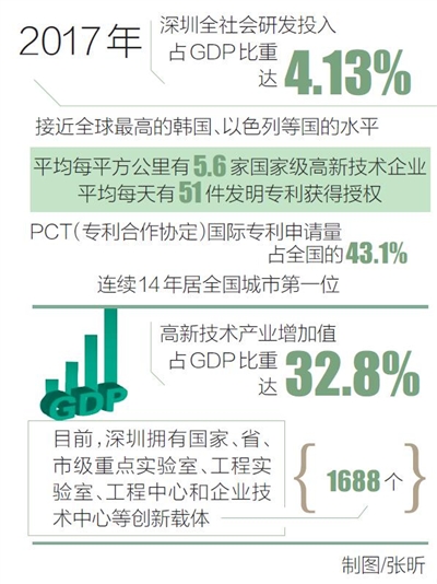 如今,创新已成为深圳经济高质量发展的强劲引擎。据统计,2017年,深圳全社会研发投入占GDP比重达4.13%,平均每平方公里有5.6家国家级高新技术企业,平均每天有51件发明专利获得授权,高新技术产业增加值占GDP比重达32.8%,成为全国创新发展的一面旗帜。