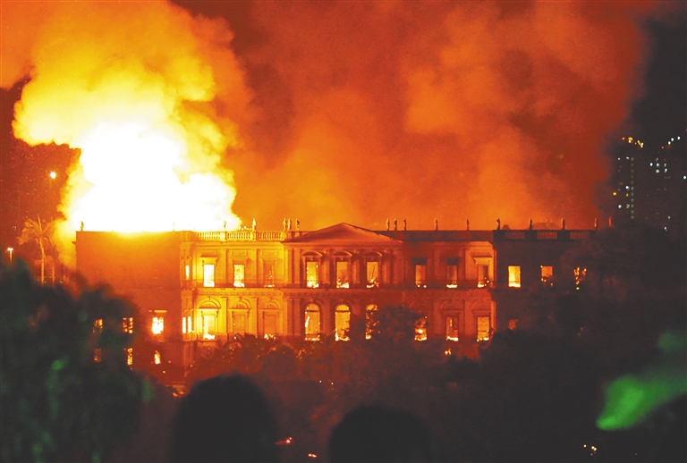 巴西国家博物馆位于里约热内卢州首府里约热内卢市北部,靠近著名的马拉卡南体育场。巴西电视台当晚播放的画面显示,火光燃亮夜空,浓烟升腾,火势在有着数百个房间的博物馆建筑全面蔓延。
