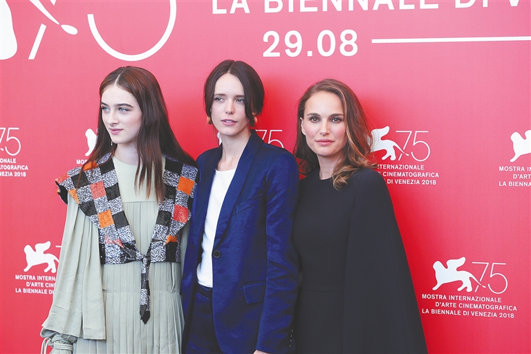 9月4日,第75届威尼斯电影节主竞赛单元参赛片《光之声》女主演拉菲·卡西迪、斯泰茜·玛蒂和娜塔莉·波特曼(从左至右)出席拍照式。