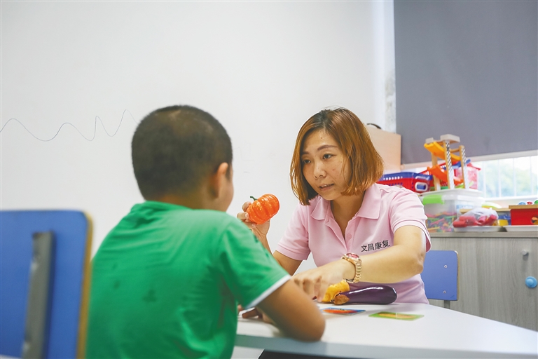 据了解,文昌市三类残疾儿童康复培训中心主要提供智障儿童学习能力评估、智障儿童康复培训等服务。文成是文昌市建档立卡贫困户在校生,该康复培训中心不仅给他免去了全部学费,还安排老师轮流家访,为文成一家提供相关帮助。 本报记者 袁琛 摄