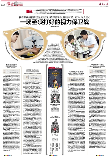 9月3日开学第一天,在海口海之南外国语实验学校开展的“国旗下的讲话”活动中,爱护眼睛成为这个活动的第一个重要主题。“应该让全校师生都意识到爱护眼睛的重要性。”校长张洁说。防控儿童青少年近视已引起社会各界高度重视,但要更好地呵护青少年的视力健康,无论是政府、教育机构、医疗机构,还是家长,还有很长一段路要走。