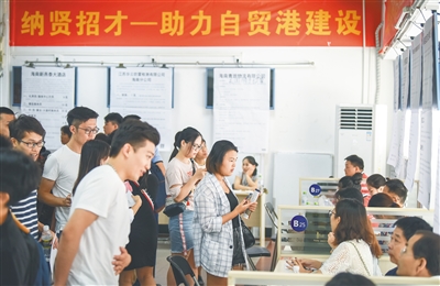 9月8日,海南省人力资源开发局一楼公共服务大厅内人头攒动,应聘者手持简历,向招聘单位求职。