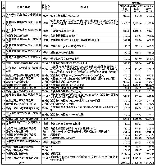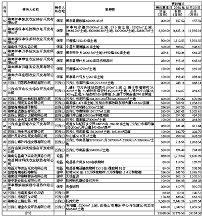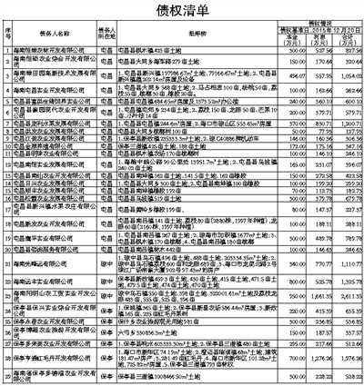 截止2015年12月20日,上述债权本金合计人民币220,180,642.41元,利息合计人民币371,765,229.44元,债权本息合计人民币591,945,871.85元(2015年12月20日之后产生的利息、罚息和违约金等相关权益,以及与债权相关的从权利亦在本次招商范围内),债权清单如下: