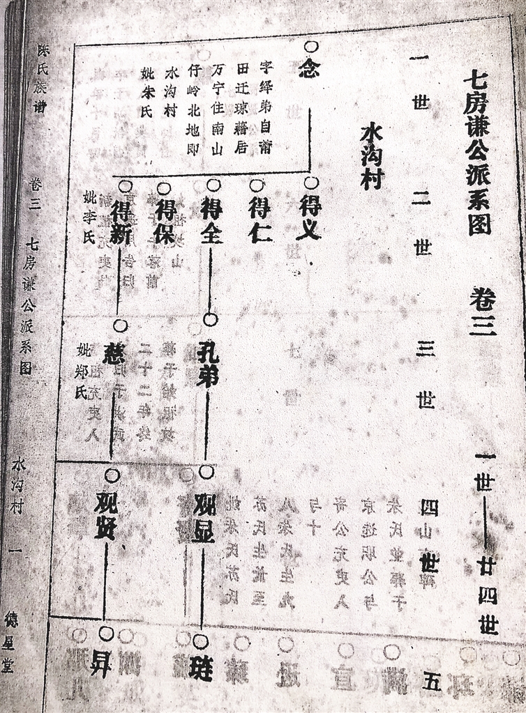 在近现代,水沟村亦出了不少革命志士。“2008年去世的陈光焯就是其中一位。”陈东秀说,陈光焯曾经考取黄埔军官学校西南军政大学,参与抗日战争。抗日战争胜利后,国民党发动内战,陈光焯选择加入共产党,为人民而战,“全国解放后,他又继续投入了抗美援朝战争,转业回乡后担任小学校长,一直热心公益事业。1989年秋季修谱便是他发起的。”