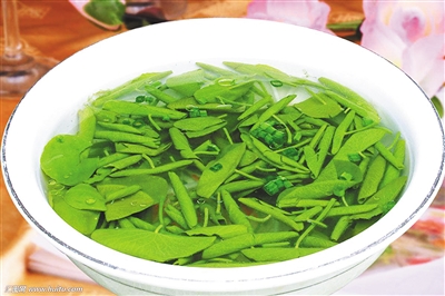 莼菜浮在水面上,其叶碧翠,清雅宜人。莼菜花开的时候,丰腴多姿,芳香四溢。唐朝诗人严维在诗中写道:“江南季春天,莼叶细如弦。池边草作径,湖上叶如船。”初春时节,江南的细雨如丝,一泓春水中,莼菜展现着一抹清亮细滑的风韵,带着无限清新和鲜美,透着勃勃生机,铺满一池碧绿,时光静美,莼菜的绿意逶迤,远树摇曳,青岸渐平,望着如出水芙蓉的莼菜,一种温柔、爱意、思念便油然生起。有一首宋词这样写道:“过垂虹四桥飞雨,沙痕初涨春水。……爱滑卷青绡,香袅冰丝细。……湘湖外,看采撷芳条,际晓随鱼市,旧游谩记,但望极江南。秦鬟贺镜。渺渺隔烟翠。”字里行间都是对莼菜的宛转低吟。莼菜脱俗可人,清韵雅致,美味无穷。