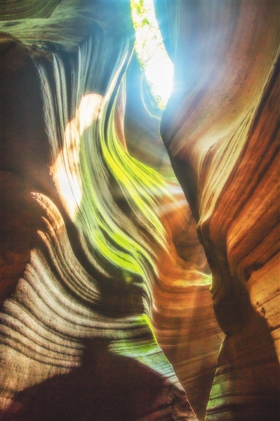 谷底深处,一片清凉,那是一线天,狭窄深长,仅通一人。石缝之间,隐约见日,在昼犹昏。砂岩上延伸流畅的波浪纹理,营造了强烈的三维立体效果。犹如时空隧道里穿越,战战兢兢,手脚并用,探索地心之奥秘,别有一番探险意趣。