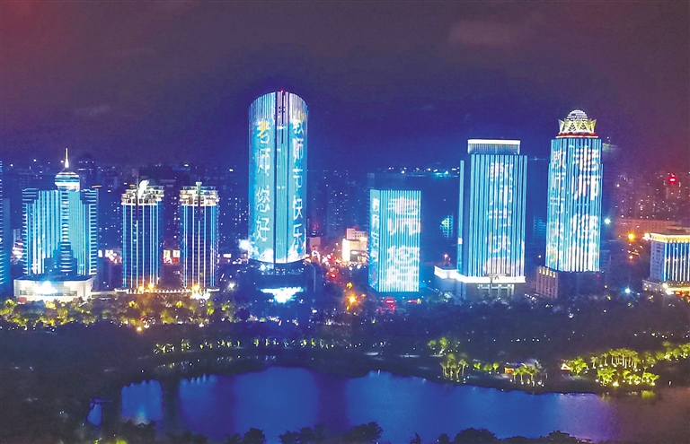 记者10日晚在海口市国兴大道、滨海大道等地看到,高层建筑纷纷亮起LED灯,用“老师,您好!”“教师节快乐!”等标语向全省12万名教师送去节日祝福(见右图,海报集团全媒体中心记者 汪承贤 摄)。此外,儋州、琼海、万宁、定安、乐东、临高等市县也纷纷利用当地的地标建筑“为教师亮灯”,营造浓厚的节日氛围。
