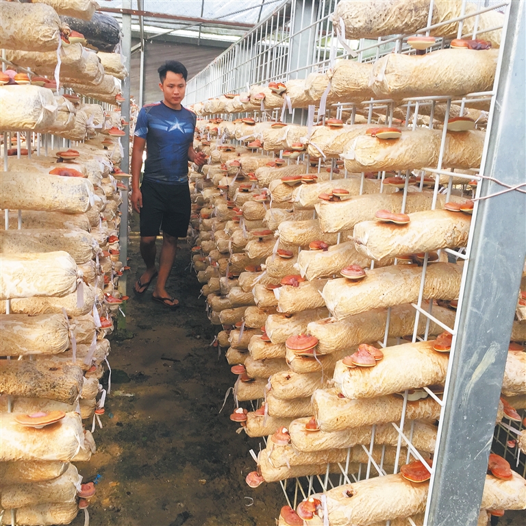 “去年保亭毛感乡从我们基地采购了4万多个灵芝菌包,发放给当地贫困户种植,我们基地技术员从平整土地到灵芝长成收获,全程跟踪技术指导,确保贫困户增收。”陈观福说道,一个灵芝菌包只要6.5元,政府出钱购买发给贫困户,一个灵芝菌包可以产出1到2两干灵芝,目前市场售价每斤100多元,这样算下来,每个灵芝菌包的产值可达20元左右,经济效益还是比较可观。