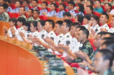今年应征入伍的新兵文鑫边听边记。“作为一名新兵,能听一场‘时代楷模’的先进事迹报告会,是我的荣幸。”文鑫说,海口舰官兵争做强军工匠、争当胜战尖兵的精气神让他备受鼓舞,热血澎湃。他说,今后要像海口舰官兵那样,练胆气,砺斗志,强作风,争当一名优秀的士兵,为实现新时代强军目标努力奋斗。