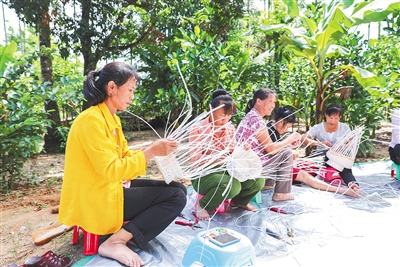 在陵水本号镇大开村的荔枝树下,一群村民指尖飞舞,正在编制竹藤。
