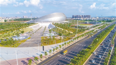 俯瞰海口市西海岸五源河文化体育中心和长滨路一带,道路宽阔整洁,绿化带“颜值”初现。