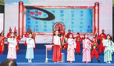 9月12日,在第21届全国推广普通话宣传周开幕式上,西昌市二小的学生诵读《木兰辞》。