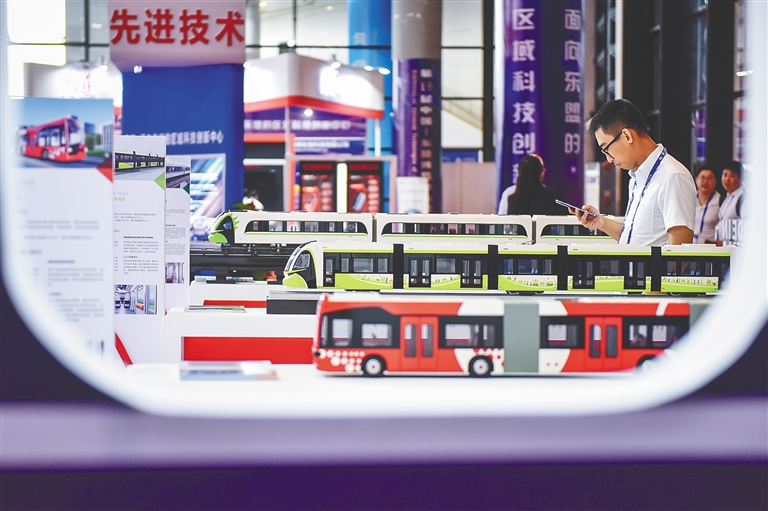 在广西南宁国际会展中心展出的中车集团的新型公共交通车辆模型(9月13日摄)。 日前,广西南宁举办的第十五届中国-东盟博览会充分展示了我国5G技术与应用、卫星导航应用产业合作、数字丝路产业合作、智慧城市、智能终端制造等领域的高科技成就。