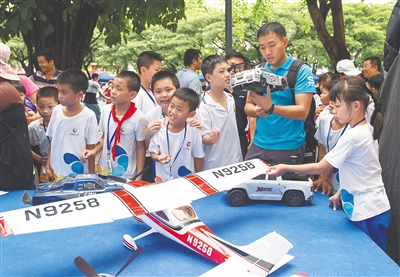 作为全场最小的航模操纵手,来自三亚九小五年级四班的学生张俊箖,操控着航模进行低空飞行表演,在空中一会画条波浪,一会画个“8”。通过校园社团接触航模近两年,他已将航模玩到了2017年全国青少年航空航天模型教育竞赛第三名的好成绩。“我以后想当飞行员!”张俊箖自豪地告诉海南日报记者,学习航模知识让他对飞机与飞行产生了兴趣,并立志成为一名能驾驶真飞机的飞行员。