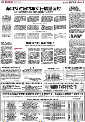 《实施细则》修订稿明确海口市网约车运力规模实行增量调控。海口市交通行政主管部门将逐步建立包括网约车在内的出租汽车运力动态调整机制,制定包括网约车在内的出租汽车运力动态调整方案。
