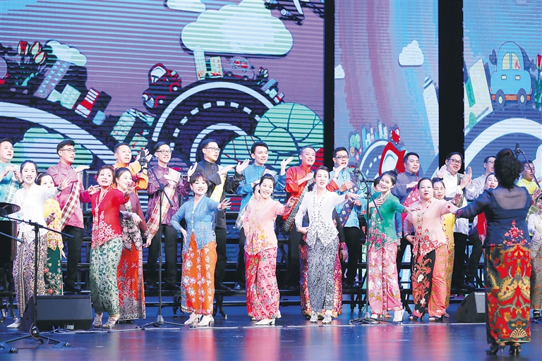 9月14日晚,2018中国青岛(即墨)国际合唱大会首场音乐会开唱,来自多国和地区的40余支合唱团将在5天里切磋技艺。图为马来西亚演员在合唱《哎哟妈妈》。 新华社发