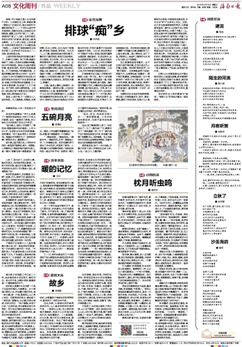 秋夜露浓,我总是抵近墙角,聆听秋虫的吟唱。幽幽清音,有诗一般的韵味,仿佛回到篱笆环绕、青苔瓦松的老屋。一口古井,一棵歪柳,一庭风月。老屋里盛放着生活的歌哭、蓬勃的乡愁和温暖的记忆。