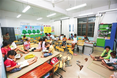 9月16日晚8时许,台风带来降雨不断,位于文昌市文城中心小学的安置点,被安置的群众在教室里看书,教室里还有饮用水、饼干、棉被等物资。