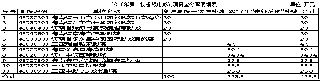 根据《海南省财政厅 海南省文化广电出版体育厅关于印发<海南省电影事业发展专项资金征收使用管理办法>的通知》(琼财非税[2015]2086号)及国家电影专资相关政策规定,拟安排2018年度第二批省级电影事业发展专项资金438.5万元(详见附表),现予以公示。公示期为2018年9月18日-9月25日。如对公示内容有异议,请在公示期内以书面形式向我厅反映,并提供相关证明材料及意见提出人的姓名、单位和联系方式。 联系人和电话:黄志强,65370960。地址:海口市海府路59号13楼1324房。