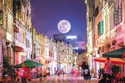 若想“穿越”老街观月,大家还可以相约去冯小刚电影公社,漫步在民国风情的街头,坐在广场仰头赏月,听钟楼敲响钟声,感受老街古楼的独特韵味。此外,“南山秋蟾”是崖州古八景之一,中秋节到南山景区赏月也别有韵味,夜幕降临,好友结伴在此游园,礼佛拜月、听涛踏浪,尝素点、品清茗、听禅乐,感受月夜禅境。