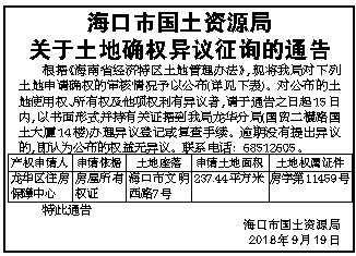 海口市国土资源局 关于土地确权异议征询的通告