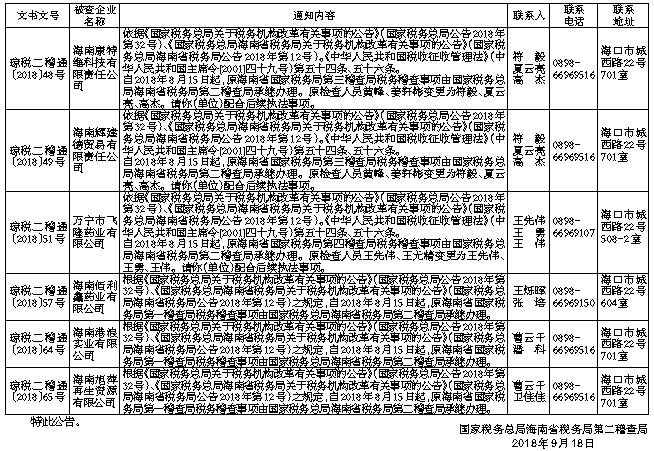 海南康特维科技有限责任公司(纳税人识别号: 91469027MA5RHJCQ4C,法定代表人: 龚汇)、海南辉建德贸易有限责任公司(纳税人识别号: 91469027MA5RHJCD8D,法定代表人: 邵锋炼)、万宁市飞隆药业有限公司(纳税人识别号:91469006MA5RHMTF0E,法定代表人:罗成刚)、海南佰利鑫药业有限公司(纳税人识别号: 91460100MA5RJA2H3Q,法定代表人: 刘静)、海南港浪实业有限公司(纳税人识别号:91460300MA5RC4C46X,法定代表人:黄辉)、海南旭萍再生资源有限公司(纳税人识别号:460100394131248,法定代表人:沈爱萍):
