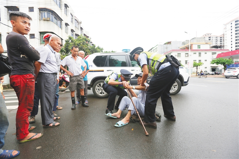 9月17日,文昌市文城镇,一位老人不慎摔倒。警察接到市民的求助电话后,迅速赶到现场,帮老人穿好鞋子,把老人扶起来。在确保老人没有大伤后,又通知了其家属。随后老人的儿子赶到现场把老人带回了家。
