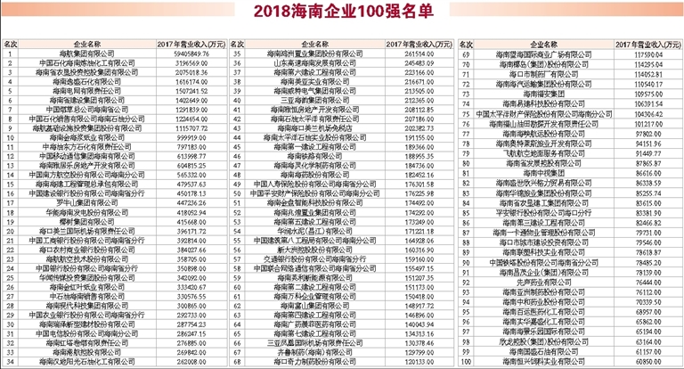 为推动海南省大企业进一步提高效益水平,打造优势企业,充分发挥其示范引领作用,培育发展更多拥有自主知识产权和知名品牌的骨干企业。海南省企业联合会、海南省企业家协会在省政府有关主管部门的大力支持下,经相关部门推荐,在海南省企业自愿申报的基础上,参照国际上通行的做法,以2017年企业营业收入为入围标准,排序出2018海南省企业100强,现将名单予以公示。公示无异议将进行表彰。公示期:2018年9月19日至9月25日,电话:(0898)66569335传真:(0898)66569396。 海南省企业联合会 海南省企业家协会 二○一八年九月十九日